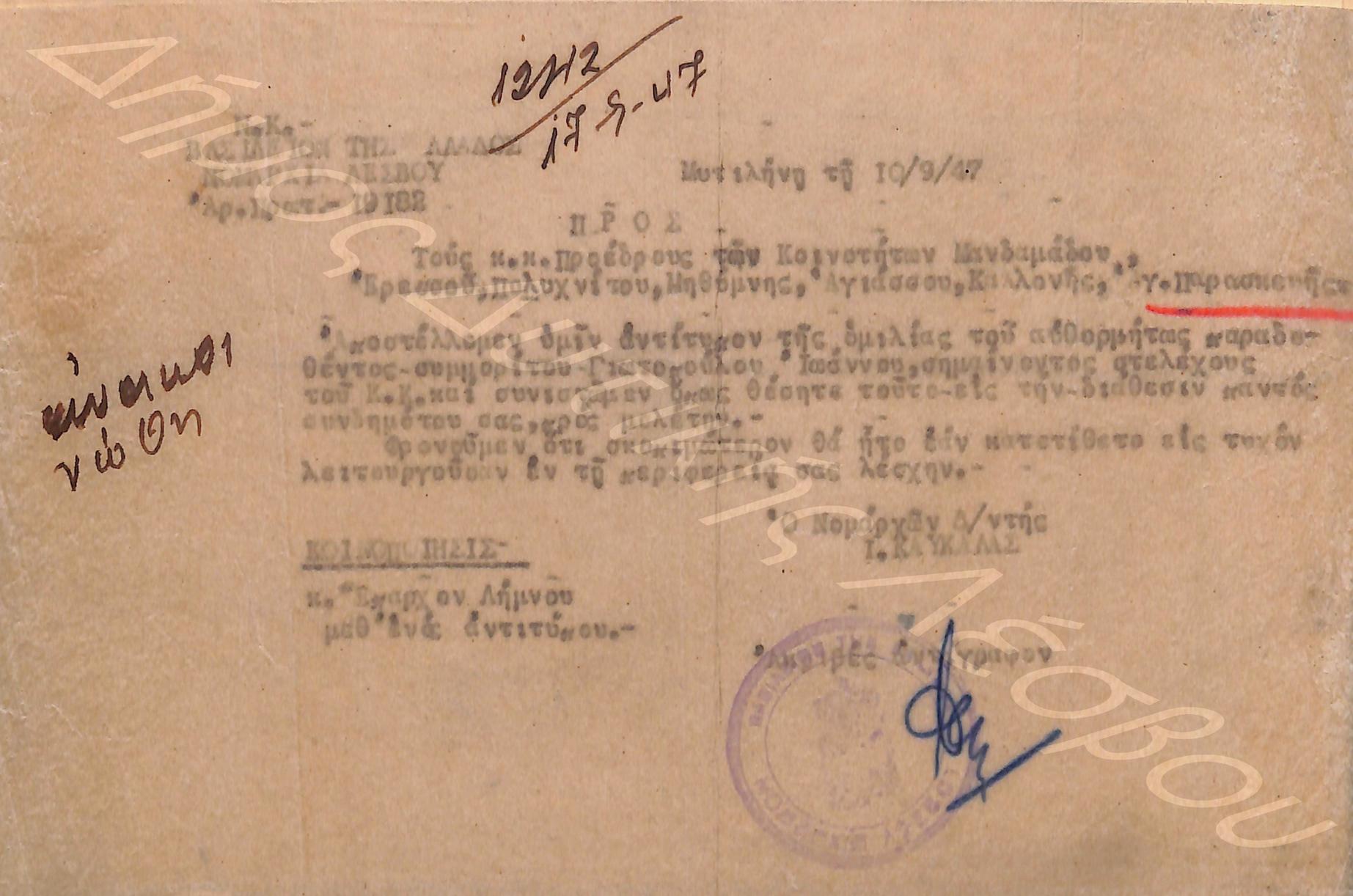 Επιστολή της Νομαρχίας Λέσβου προς τους προέδρους κοινοτήτων Λέσβου 10/9/1947